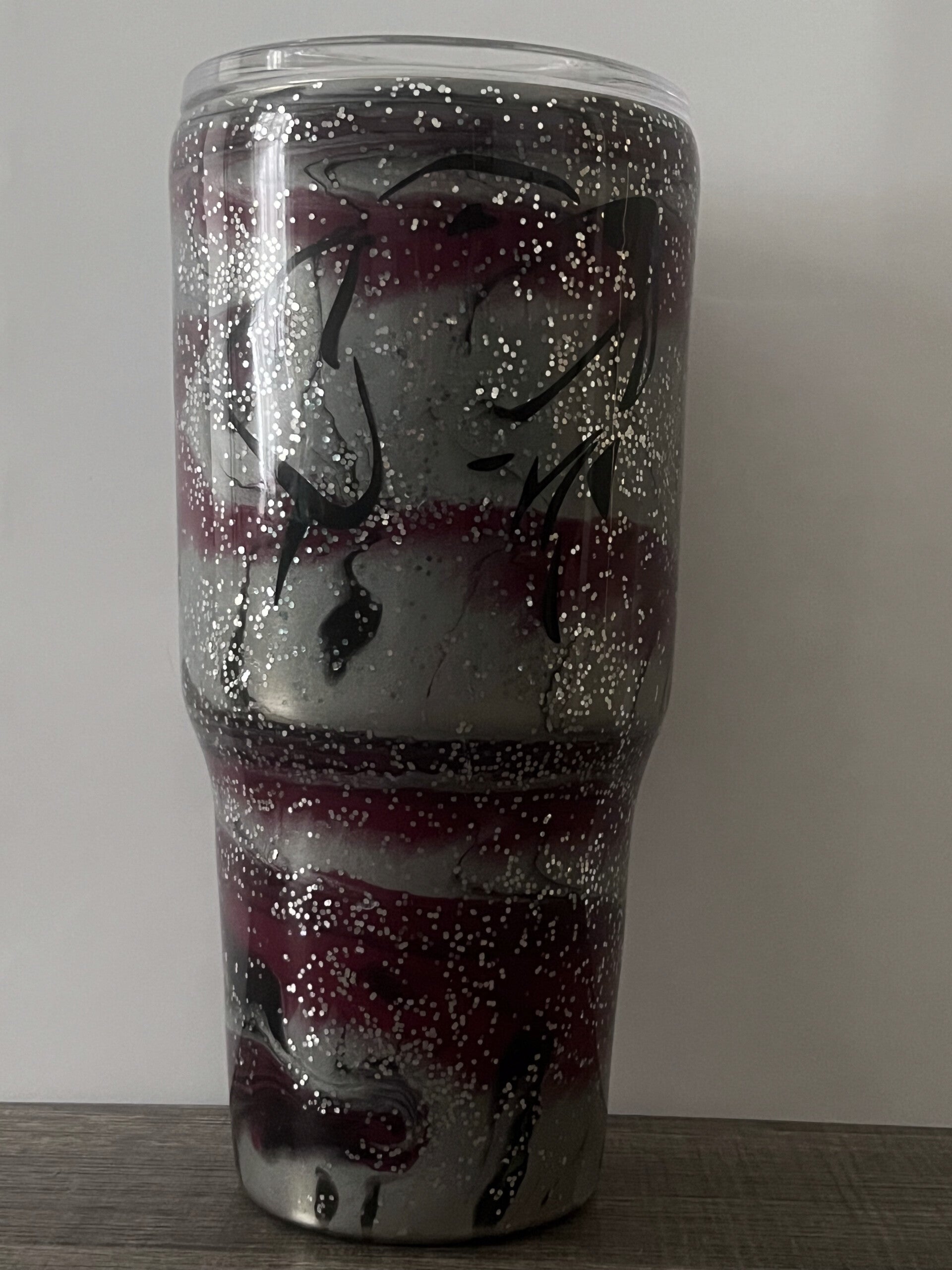 Jumbo 30 ounce tumbler in maroon and silver with black accents. Line profile of a Labrador's head in black