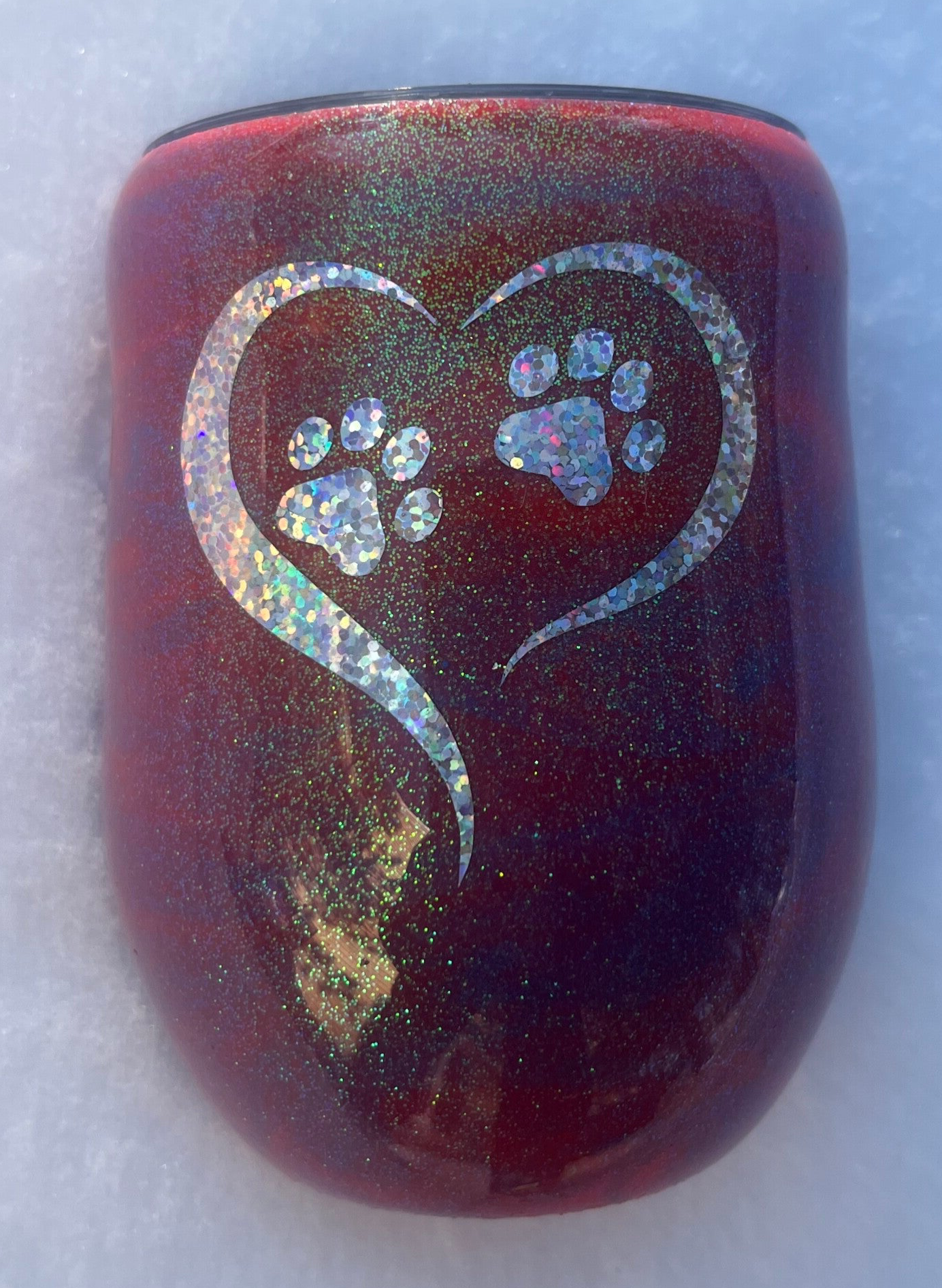 Purple and red swirled 12 ounce tumbler with holographic paw prints inside a heart.