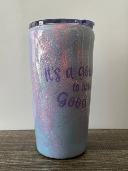 This 20-ounce tumbler's colors were inspired by a sunset I saw recently. Pastel blue, pink, and purple are swirled with silver glitter on top. "It's a Good Day to Have a Good Day" is written in light purple. If you're looking for an uplifting tumbler to drink your coffee out of, this one is for you!